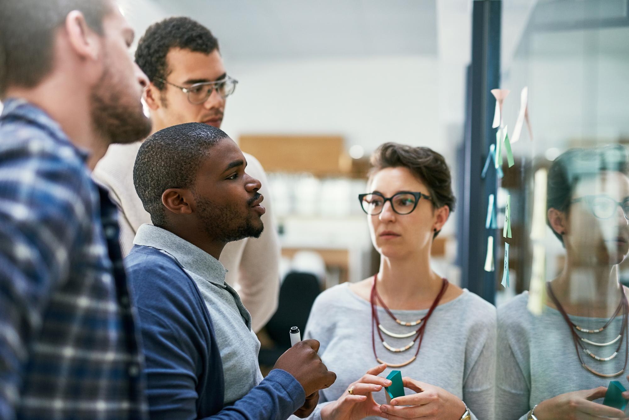 Group brainstorming with sticky notes on board.