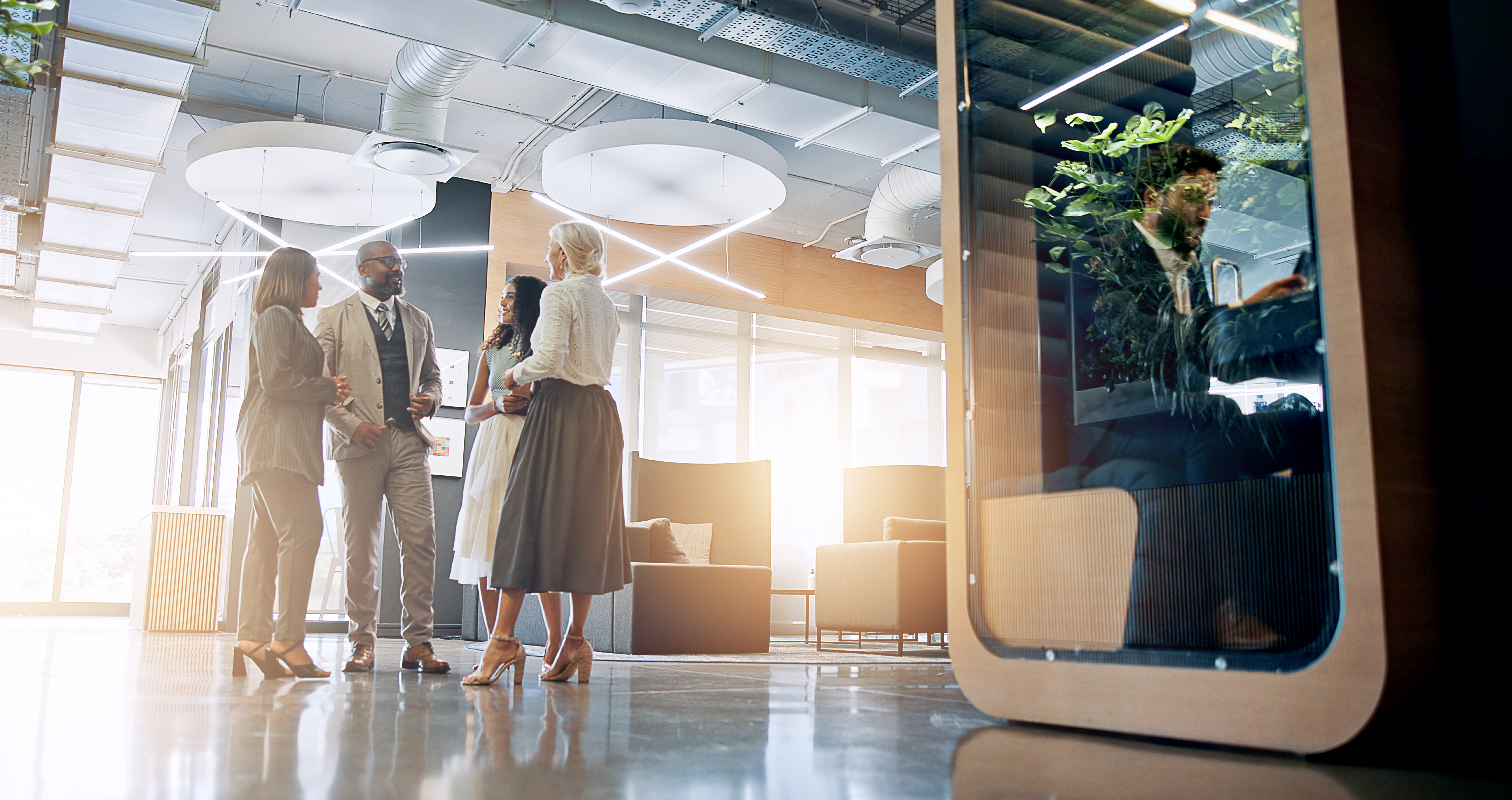 Colleagues discussing and brainstorming ideas in a corporate office environment.